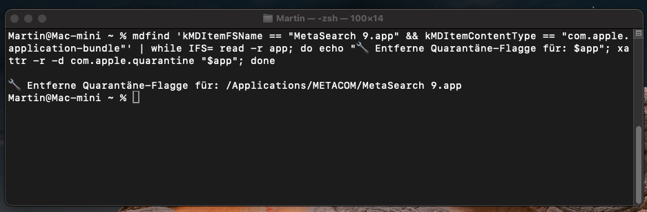 Alternativ können Sie als Hauptbenutzer bzw. Administrator des Macs ein Shell-Kommando verwenden, um das „Quarantäne-Flag“ selbst zu löschen. Beenden Sie hierfür MetaSearch 9 und öffnen Sie das zu macOS mitgelieferte Terminal. Im Terminal-Fenster fügen Sie hinter dem Eingabe-Prompt folgendes Kommando ein: mdfind 'kMDItemFSName == "MetaSearch 9.app" && kMDItemContentType == "com.apple.application-bundle"' | while IFS= read -r app; do echo "🔧 Entferne Quarantäne-Flagge für: $app"; xattr -r -d com.apple.quarantine "$app"; done Anschließend die Eingabe-Taste ("return") drücken. Das Terminal-Fenster kann nach Abarbeitung des Kommandos (Rückkehr zum Eingabe-Prompt) geschlossen werden.